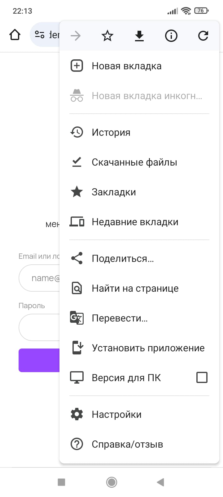 Откройте в браузере сайт с парольным менеджером и нажмите на иконку с тремя точками в правом верхнем углу