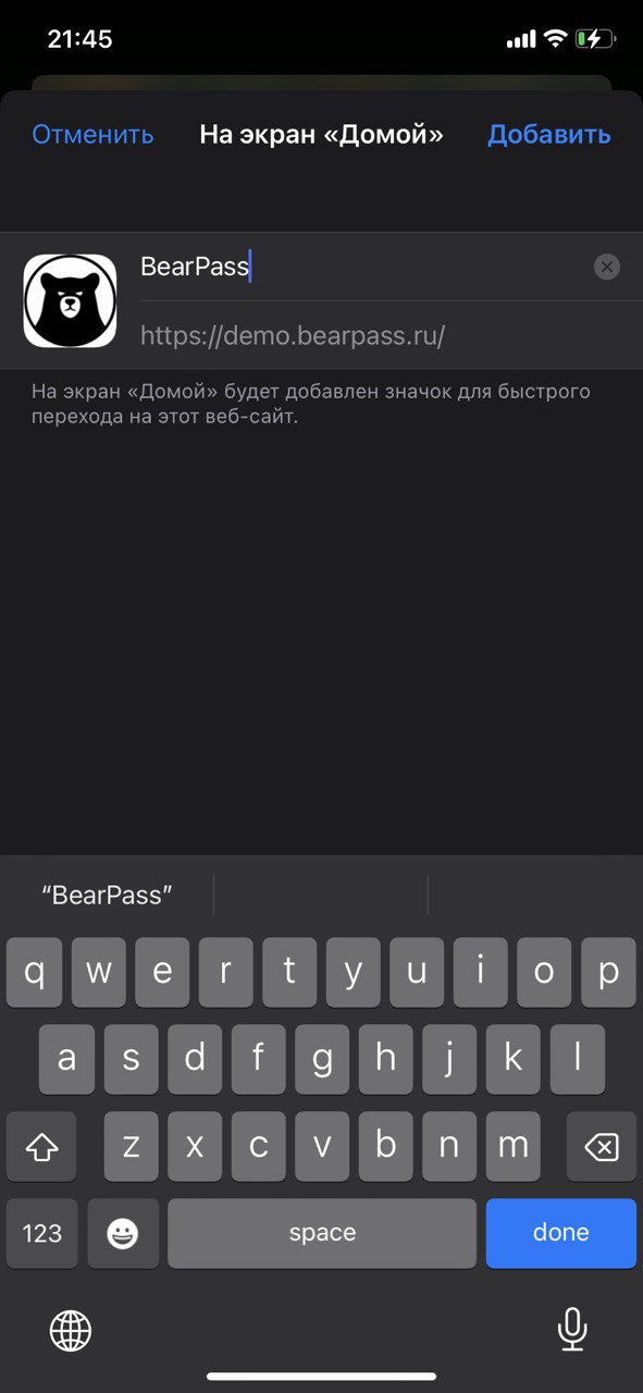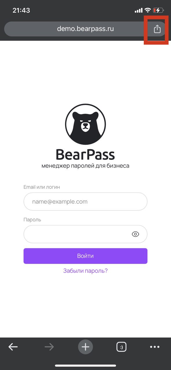 В Safari или Google Chrome откройте сайт с парольным менеджером и нажмите на иконку "Поделиться".